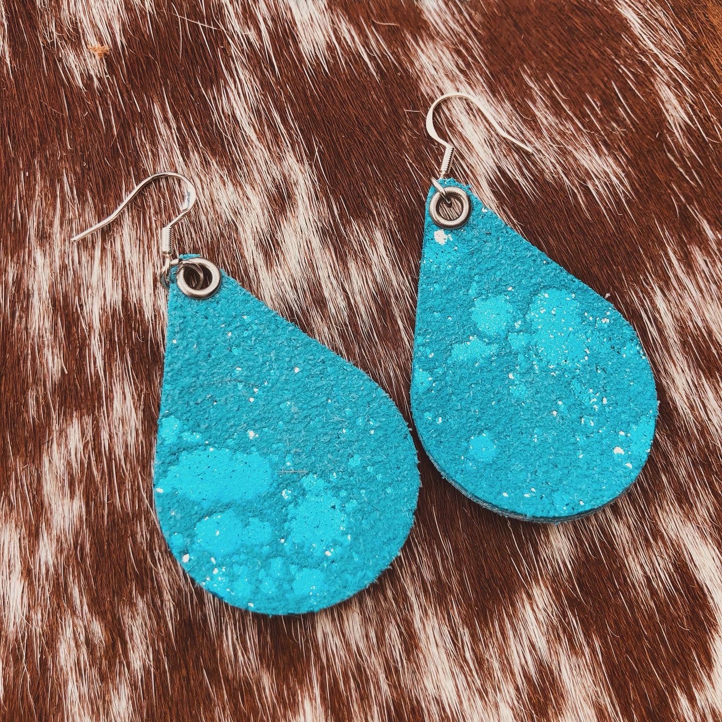 Add a pop of color to your ensemble with our Turquoise Acid Washed Metallic Leather Earrings. These western-inspired teardrop earrings are made with unique acid washed metallic leather for a unique touch. Perfect for adding a touch of playfulness to any outfit.